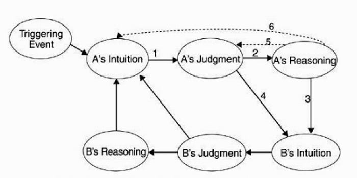 (4) Jonathan Haidt en The Righteous Mind: Why Good People Are Divided by Politics and Religion. “We make our first judgments rapidly, and we are dreadful at seeking out evidence that might disconfirm those initial judgments. Yet friends can do for us what we cannot do for our-selves: they can challenge us, giving us reasons and arguments that sometimes trigger new intuitions, thereby making it possible for us to change our minds. We occasionally do this when mulling a problem by ourselves, suddenly seeing things in a new light or from a new perspective. Link 6 in the model represents this process of private reflection. The line is dotted because this process doesn’t seem to happen very often. For most of us, it’s not every day or even every month that we change our mind about a moral issue without any prompting from anyone else. Far more common than such private mind changing is social influence. Other people influence us constantly just by revealing that they like or dislike somebody. That form of influence is link 4, the social persuasion link. Many of us believe that we follow an inner moral compass, but the history of social psychology richly demonstrates that other people exert a powerful force, able to make cruelty seem acceptable and altruism seem embarrassing, without giving us any reasons or arguments.”